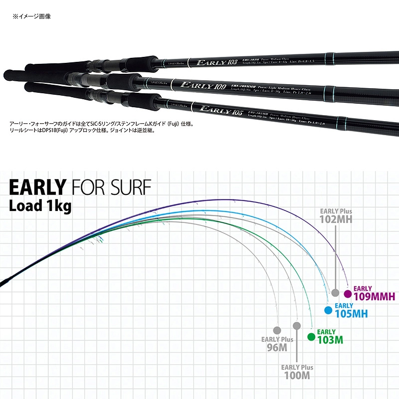 ●Field:サーフ・平磯・ゴロタ浜商品説明●EARLY 105MHは、サーフでの遠投性能と軽量かつ振り抜けの良さを追求したスペシャルモデルです。サーフやゴロタ浜において、50gまでのルアーを遠投するためにブランクを練り上げたハイパワーロッドであり、キャスト時は粘り強いバットから絞り出す様なイメージでルアーを弾き出して遠投できます。また、その粘り腰のバットパワーがファイト時には寄せと浮かせの安心感に繋がります。もちろん、軽快な使用感と強靭なパワーにより、平磯・ゴロタ浜でのヒラスズキやマルスズキ、サーフ・波止でのライトショアジギングでの青物も視野に入れた、汎用度の高いマルチな1本に仕上がってます。